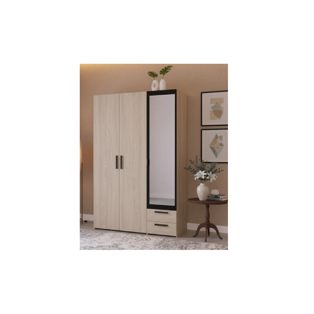 Imaginez organiser sans effort vos vêtements, chaussures et accessoires dans son intérieur spacieux. Les trois portes s'ouvrent pour révéler un grand espace de penderie, parfait pour garder les vêtements sans plis. Besoin de plus d'espace pour les articles pliés ? Les deux tiroirs pratiques offrent un rangement discret pour les sous-vêtements, les chaussettes ou tout ce que vous souhaitez garder à l'abri.