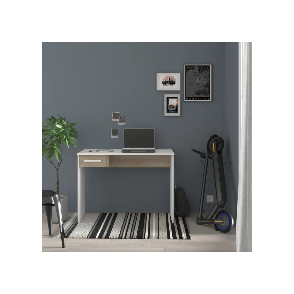 Imaginez une surface propre et dégagée – parfaite pour vous concentrer sur vos tâches. Le Bureau MILO offre exactement cela, avec des dimensions généreuses de L101xH73xP50 cm. Il offre amplement d'espace pour votre ordinateur portable, vos carnets et vos accessoires essentiels sans paraître encombrant. Besoin de ranger des documents ? Le tiroir unique intégré offre un rangement discret, gardant tout ce dont vous avez besoin à portée de main mais bien organisé.