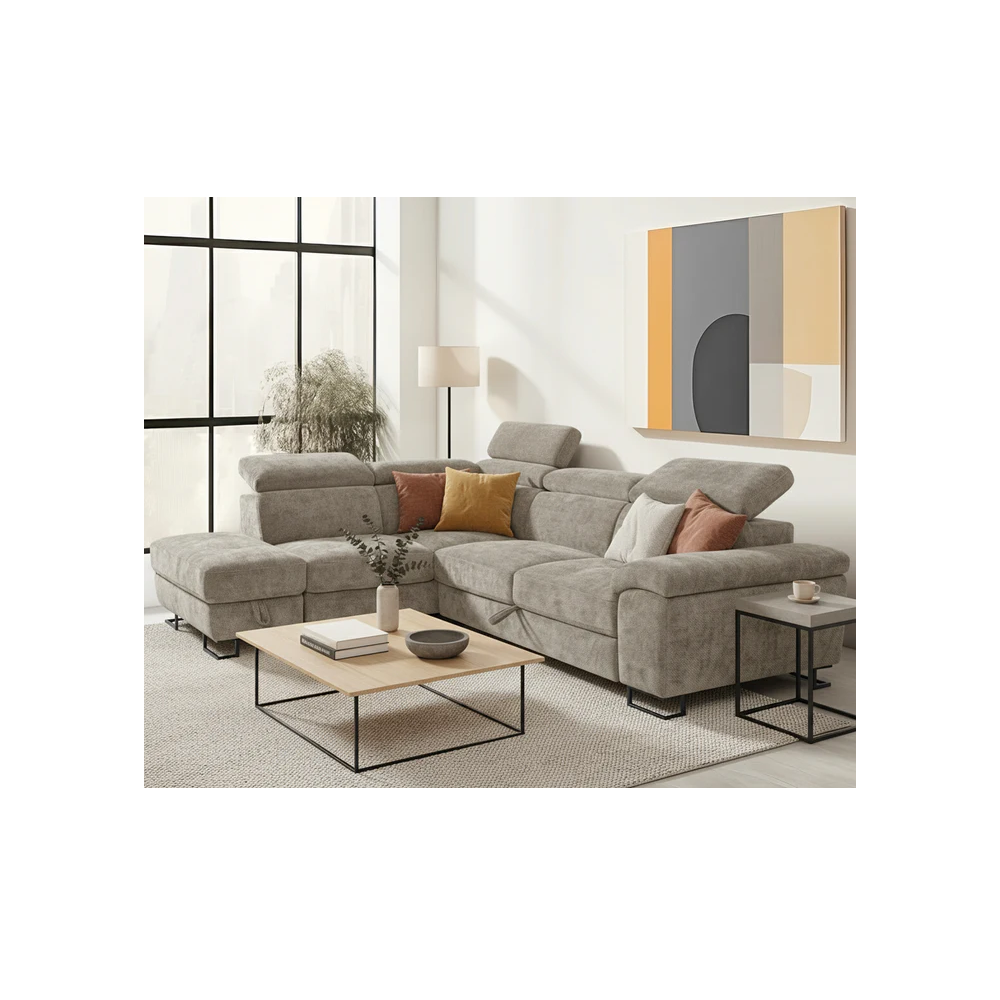 Transformez votre espace de vie avec ce canapé d'angle droit polyvalent. Nous l'avons conçu pour passer sans effort d'un coin salon élégant à un lit confortable, parfait pour les invités. Au-delà de sa double fonctionnalité, ce canapé dispose d'un généreux coffre rangement – idéal pour ranger vos couvertures, oreillers ou essentiels du salon.