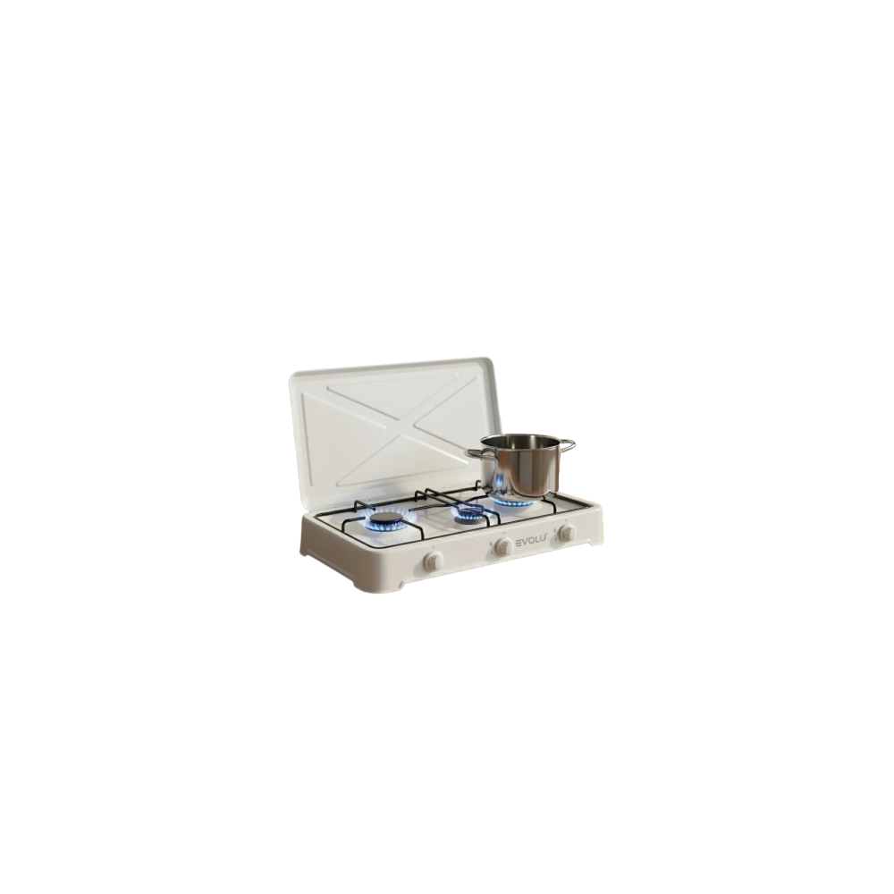 Découvrez la commodité du Réchaud Gaz 2 Feux - Couvercle Blanc Evolu, votre solution de cuisson...